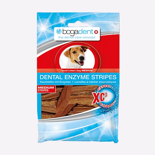 Descrição: bogadent® DENTAL STRIPES MEDIUM são a solução ideal para combinar o prazer de roer com os cuidados orais. Funcionalmente suplementados com uma formulação inovadora XF3 (enzimas naturais derivadas de concentrado whey e dois princípios ativos adicionais – extrato de frutas CB90MX e minerais). Protege contra a placa-bacteriana e a formação de tártaro e ajuda a prevenir irritação da gengiva. O saboroso couro deste snack ajuda a realizar a limpeza mecânica dos dentes durante a mastigação.